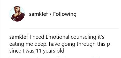 Its certainly not a good time for Nigerian entertainers as more and more of them are coming out to speak on depression and how its affecting them, In the past, superstars like Waje, Tiwa Savage, Yemi Alade and recently Harrysong have all spoken about it and now, singer and producer, Samklef just cried out saying he needs help.In his words, 'I need emotional counseling it’s eating me deep. have going through this p since I was 11 years old'. We hope he gets the help he needs urgently.