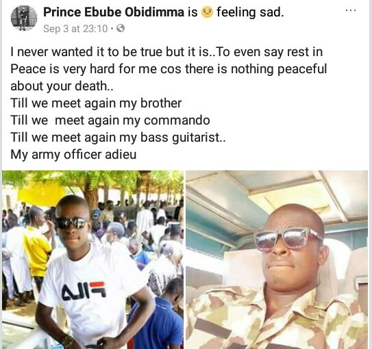 The remains of one officer and 16 soldiers were recovered last weekend in the general area of Mobbar Local Government Area, Borno State.Troops from 145 Battalion who are leading the search and rescue efforts have transferred the bodies to Maiduguri."I never wanted it to be true but it is..To even say rest in Peace is very hard for me cos there is nothing peaceful about your death," his friend, Prince Ebube, wrote."Till we meet again my brotherTill we meet again my commandoTill we meet again my bass guitarist..My army officer adieu" he added.